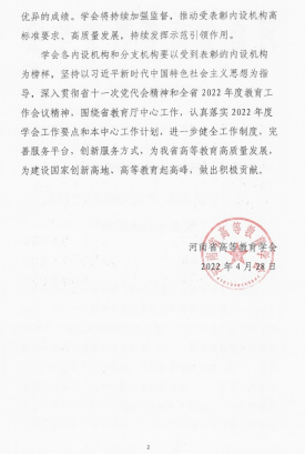 近日,河南省高等教育学会印发文件,表彰了我校承担的“河南省高等学校课程思政教学管理服务中心”在我省高等教育高质量发展中发挥的重要作用。河南省高教学会会同省教育厅高教处,通过对15个内设机构(中心)年度目标完成情况自评、认真研究和评议后,经学会领导批准,共授予4个单位为“2021年度完成责任目标优秀中心”称号。