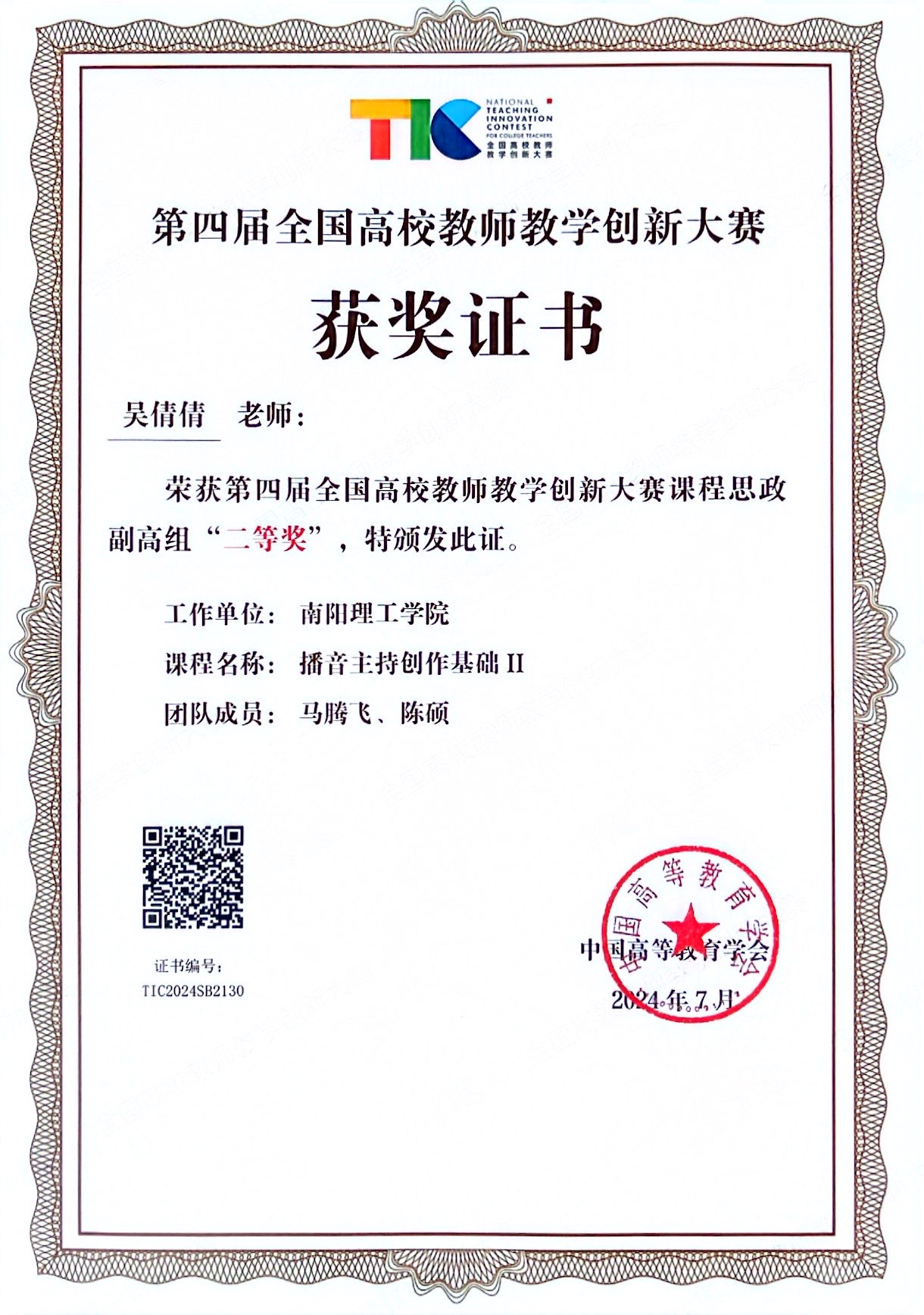 本网讯(特约记者/崔少博)7月27至31日,第四届全国高校教师教学创新大赛落下帷幕。经过激烈角逐,传媒学院吴倩倩老师荣获课程思政副高组二等奖,这是我校目前在全国高校教师教学创新大赛中获得的最高奖项。