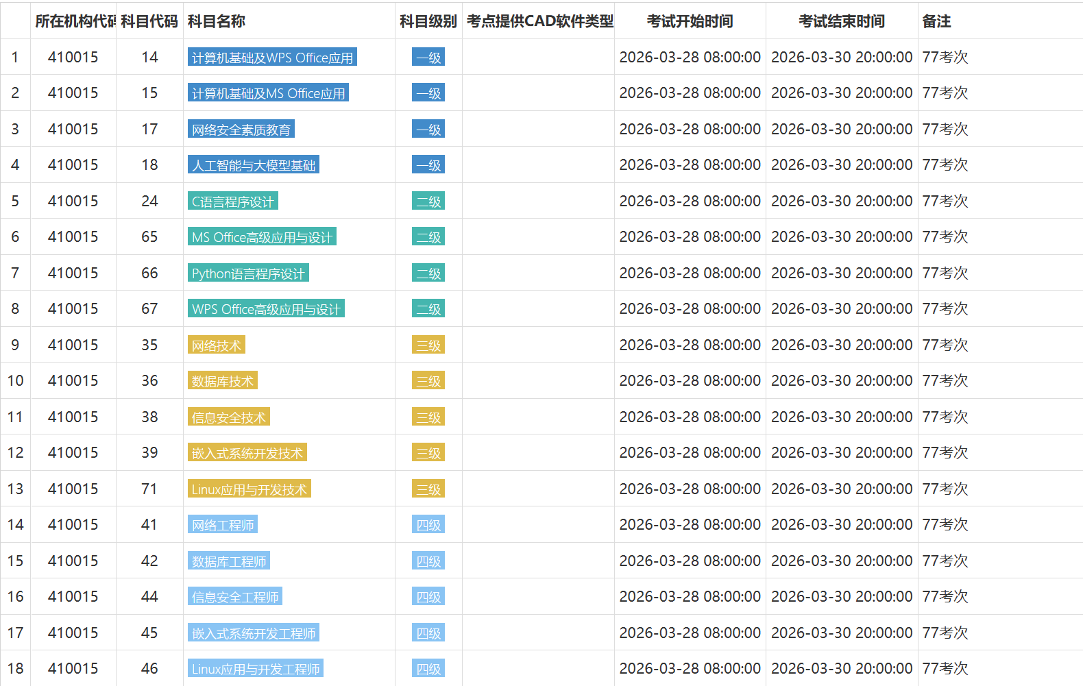 2026年上半年河南省全国计算机等级考试,南阳理工学院考点报名时间为2026年1月1日9:00-6日17:00。如因特殊原因导致不能正常开考,将另行通知,请广大考生及时关注河南省教育考试院官网及南阳理工学院网站公告信息。