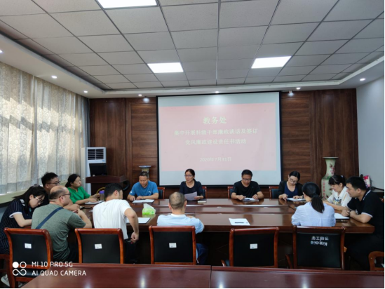 2020年7月31日上午,教务处在四号教学楼二楼会议室集中开展了科级干部廉政谈话及签订党风廉政建设责任书活动。会议由朱清慧处长主持,副处长刘尚争对全体科级干部进行集体谈话,并签订《南阳理工学院科级领导干部2020年度党风廉政建设责任书》。